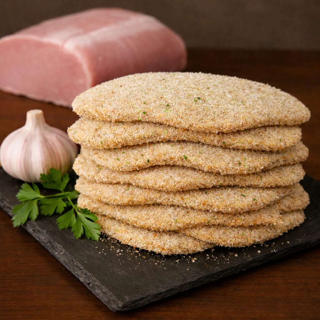 Sabrosas milanesas de lomo de cerdo rebozadas con pan rallado, huevo, leche, ajo y peregil.